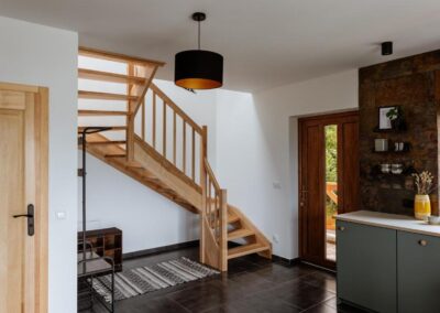 na parterze znajduje się salon z kominkiem, kuchnia oraz łazienka.
